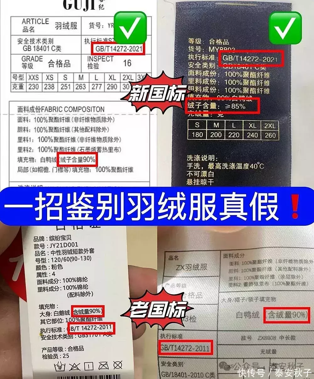首先,看看吊牌上有没有这样的一行数字——“GB/T 14272-2021”,这串数字可不简单,它是2022年4月之后就开始实行的新国标,只要是真正的羽绒服吊牌上一定要有它。