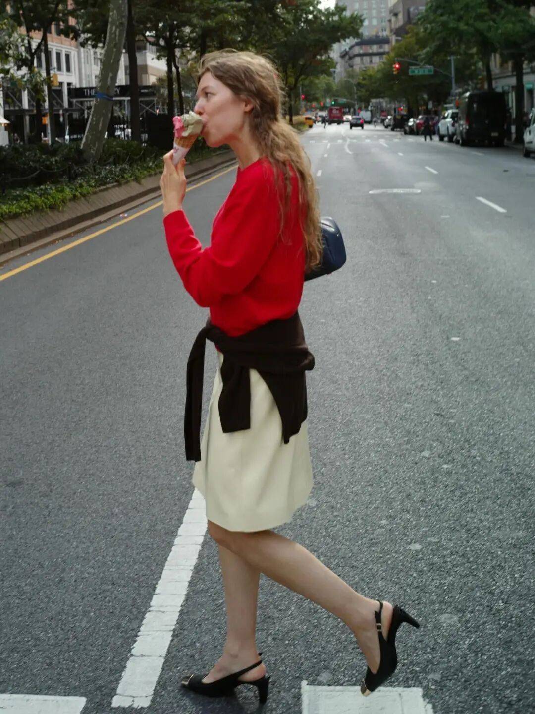 对于你的夏装先别急着收!用一件针织衫围在腰间,不仅能应对早晚温差,更能明确腰线,优化比例。选择与连衣裙顺色的针织衫,高级感拉满;选择对比色,则碰撞出意想不到的时髦火花。